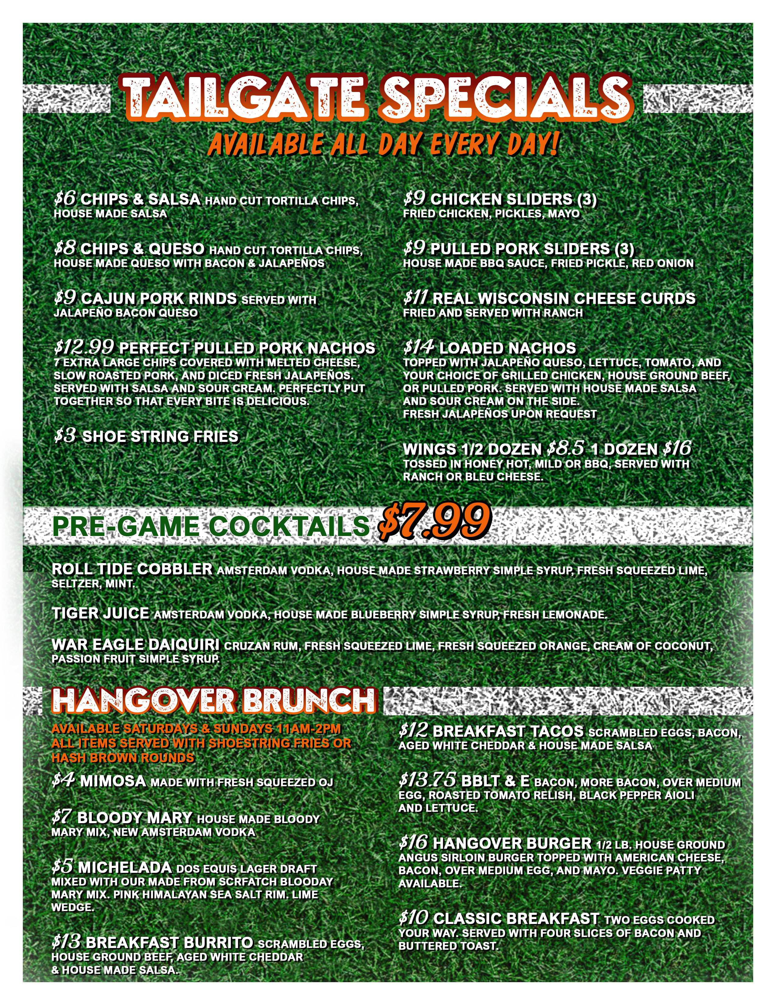 View our Lunch Specials Menu below. Daily Specials and Tailgate Deals are back!